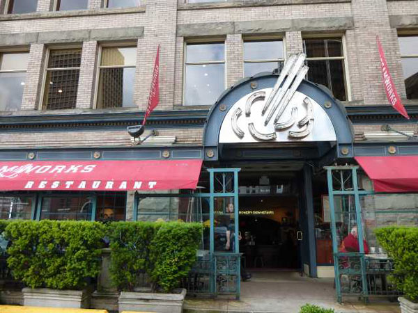 「STEAMWORKS」は五つ星のレストランではありませんが、ガスタウンのシンボルである蒸気時計がある通りから入った所にあるカジュアルな雰囲気のレストランです。すぐ近くにはウォーターフロント駅があります。