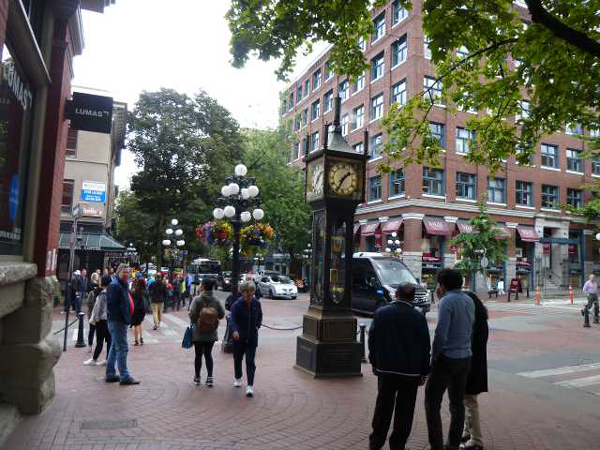 ギャスタウン(Gastown)は、「バンクーバー発祥の地」と呼ばれています。バンクーバーの大都会の中でも、石畳の道路やレンガ造りの建物が多く、何となくレトロな雰囲気を持っています。1977年に作られた蒸気時計は街のシンボルであり、15分ごとに汽笛が鳴ります。時計の周辺で立ち止まって写真撮影する観光客が大勢います。