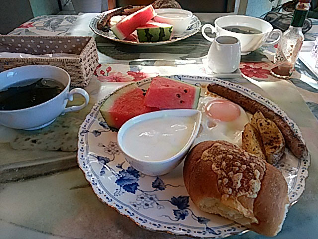 パン、スープ、ヨーグルト、目玉焼き、ウィンナー、フルーツ、コーヒー、何とも豪華な朝食です。