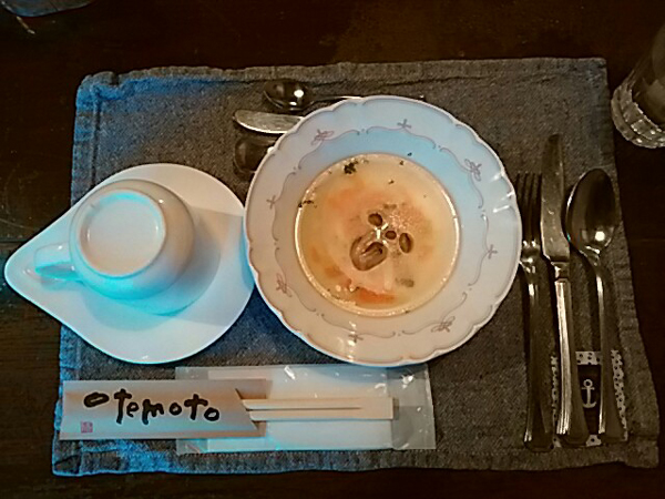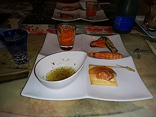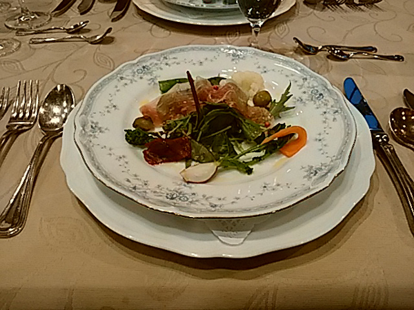 夕食はフランス料理です。オードブル、スープ、魚料理、肉料理、デザートとおいしく頂きました。平日はお客も少なく、3組でした。