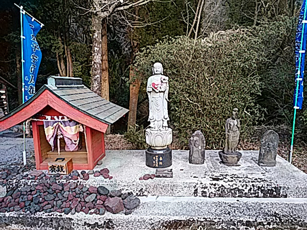 御神体はここから急な坂を下りた川床にありますが、奥まで行けない人のために、こちらにお地蔵様がおられます。