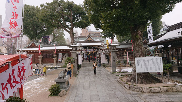 大きなビルが立ち並ぶ中に隠れるように立っている少し小さめの神社で、縦に長い参道があります。